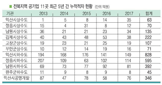 행정안전부가 지난 5일 공개한 ‘2017사업연도 지방공기업 결산’결과에 따르면 익산시 상·하수도와 정읍시 상·하수도, 남원시 상·하수도, 김제시 상수도, 고창군 상수도, 부안군 상수도, 완주군 하수도, 익산시 공영개발 등 11곳이 5년간 2874억 원의 손실을 기록했다. 지난해만 해도 손실액이 582억 원이다.