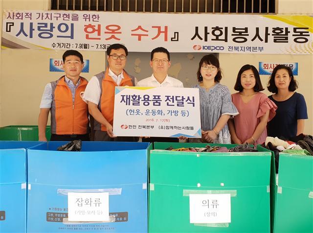 이번 행사는 한전 본부 직할 전 직원·검침사 등이 참여해 1주일간 수거 기간을 통해 재활용이 가능한 의류, 운동화, 가방·침구류 및 잡화 등 다양한 물품을 수거해 사회적 기업에게 전달하는 행사를 가졌다.