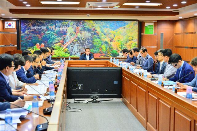 ▲ 지난 20일 황숙주 순창군수 주재로 군청 영상회의실에서 부서별 국가예산확보 및 현안업무 추진상황보고회가 열리고 있다.