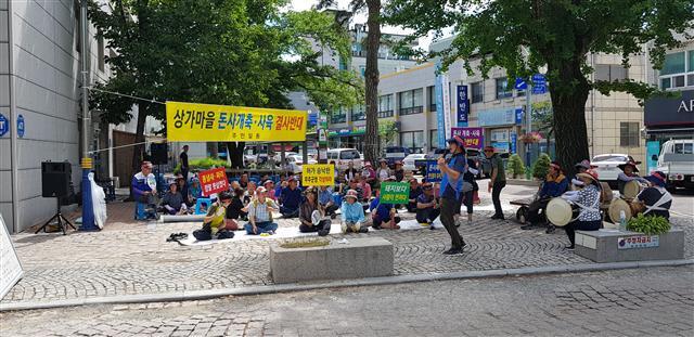 무주군 적상면 삼가리 상가마을 주민 60여명이 23일 무주군청 옆 차쉼터 앞에서 군수를 비롯한 관련부서장, 담당자와의 면담과 자신들의 목소리에 귀 기울여 줄 것을 요구하고 나선 것.
