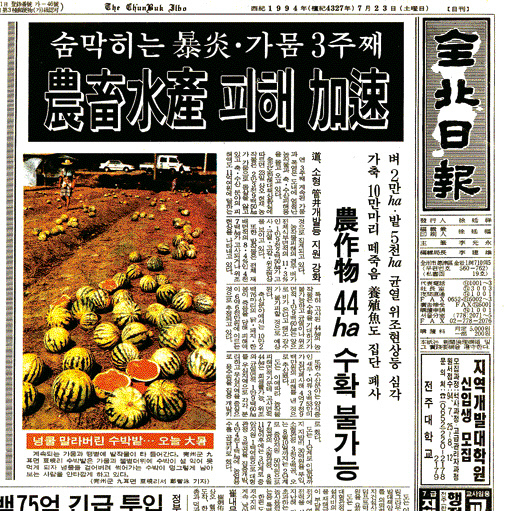24년 전인 1994년 7월 23일자 전북일보에는 ‘숨 막히는 폭염·가뭄 3주째’, ‘폭염 속 물길 찾기 안간힘’, ‘하늘도 무심… 곳곳서 한숨 소리’ 등 폭염 관련 기사가 6개면 13건에 달했다. 폭염에 길어진 가뭄까지 겹쳐 농가 피해가 크다는 보도가 이어졌다.