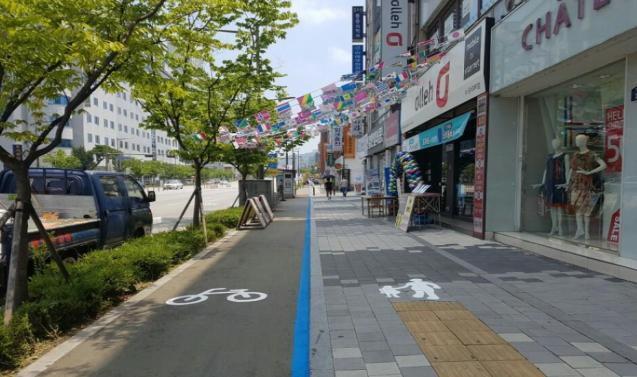 또 인도와 차도경계에 설치된 경계석 단차(높이 3cm 정도)를 없애 자전거 및 휠체어 이용자들이 인도 턱을 오르내리기 편리하도록 개선했다.
