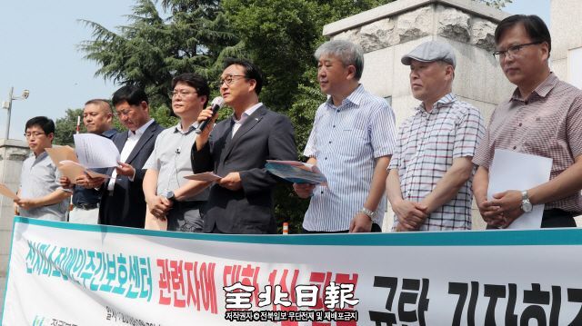 전북도사회복지사협회와 전북지역사회복지교수협의체, 한국장애인주간보호시설협회 전북협회 회원 10여 명은 7일 오전 전주지법 앞에서 기자회견을 열고 1심 판결을 규탄했다.