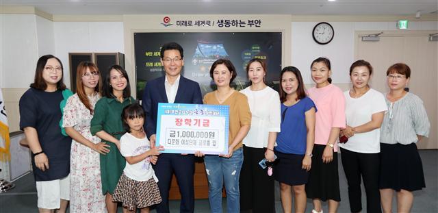 부안군 다문화여성단체 ‘글로벌 맘’(회장 서예진)은 지난 10일 부안군청을 방문해 마실축제기간 다문화부스운영 수익금 일부를 인재육성에 써달라고 장학금으로 기탁했다.