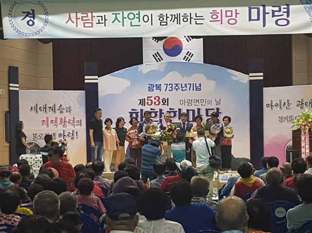 이날 기념식에서는 3개 부문에서 각 1명씩 모두 3명에게 마령면민의 장이 수여됐다. 문화체육장은 강수영(47·익산시 거주), 애향장 전명식(52·서울 광진구 거주), 효열장은 김희정(62·마령면 강정리) 씨가 각각 수상했으며 부상으로 은수저 세트가 주어졌다.