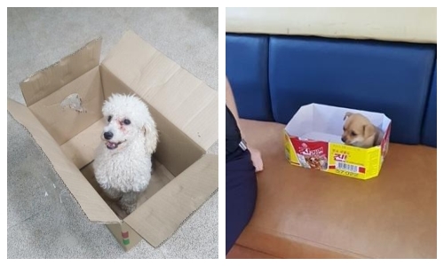 ▲ 지난 9일 익산 여산파출소 앞 도로에서 한 주민이 과자상자에 갇혀 있었던 흰색 푸들을 발견했다.(왼쪽) 같은 날 파출소 주변에서 갓 태어난 황색 잡종견이 컵라면 상자에 버려진 채 발견됐다.