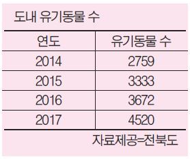 전북도에 따르면 도내 유기 동물은 지난 2014년 2759마리에서 2015년 3333마리, 2016년 3672마리, 2017년 4520마리 등 매년 증가하고 있다. 도내에서 매일 12마리의 반려동물이 버려지고 있는 셈이다.