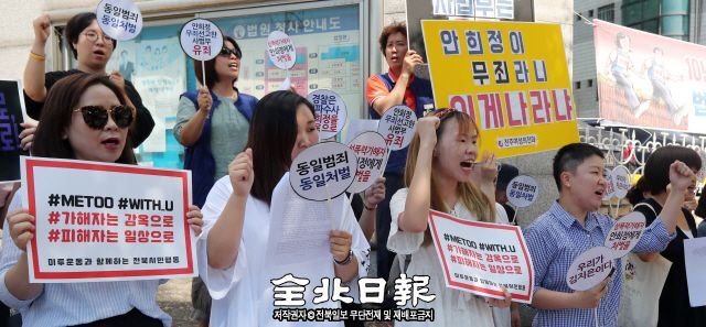 (사)전북여성단체연합 등 여성단체가 중심이 된 도내 37개 시민단체는 16일 전주지방법원 앞에서 기자회견을 열고 “지난 14일 법원은 피고인 안희정 전 충남지사에게 무죄를 선고했다”면서 “무죄판결은 성폭력 사건의 강력한 증거인 피해자의 진술 신빙성을 부정하고 여전히 업무상 위력에 대한 판단을 엄격하게 해석했다”고 밝혔다.