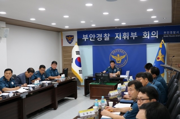 부안경찰서(서장 임성재)는 17일(금) 오전 2층 소회의실에서 경찰서장, 각 과·계장, 지구대·파출소장 등 30여명이 참석한 가운데 ‘부안경찰 지휘부 회의’를 개최했다.