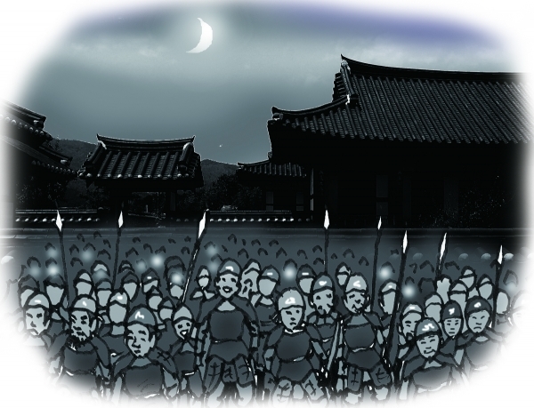 이제 비담은 거침없이 말을 뱉는다. 깊은 밤, 자시(12시)가 넘었지만 비담의 저택은 열기로 덮여 있다. 넓은 앞뒤 마당은 소리죽여 움직이는 군사들로 가득 차 있는 것이다. 밖에 모인 군사는 2천여 명, 비담의 호위군에서 골라 뽑은 용사들이다. 비담은 그들을 지휘할 장수들로 화랑 유재와 석기수를 임명한 것이다. 주위에 둘러선 장수, 대신들의 얼굴은 상기되어 있다. 비담이 말을 이었다.