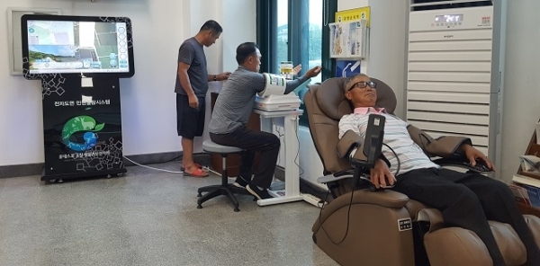 28일 아산면에 따르면 민원실을 찾는 주민들이 편안하게 쉬어갈 수 있도록 자동안마의자와 초음파 자동안경세척기, 지역특산품인 복분자 사탕, 젤리류 등을 제공하고 있다.