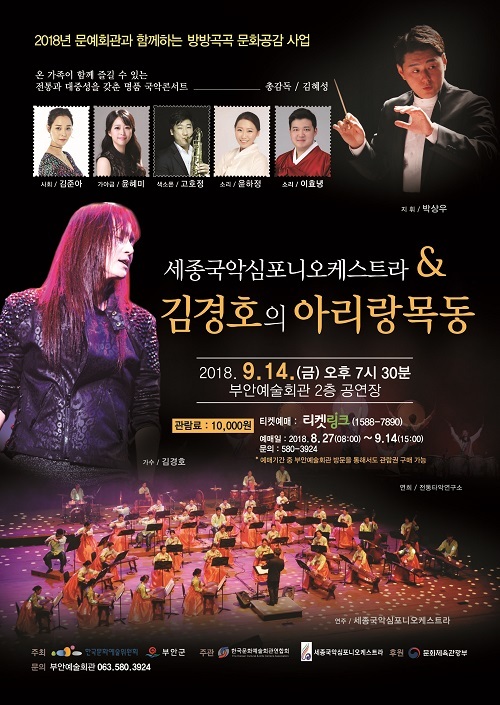 ‘세종국악심포니오케스트라 & 김경호의 아리랑 목동’ 공연 오는 14일 오후 7시 30분 부안예술회관 공연장에서 펼쳐진다. 부안군(군수 권익현)은 2018년 문예회관과 함께하는 방방곡곡 문화공감 사업에 선정되어 문화체육관광부 후원으로 수준 높은 공연들을 군민에게 선보이고 있어 이번 공연도 기대를 모으고 있다.