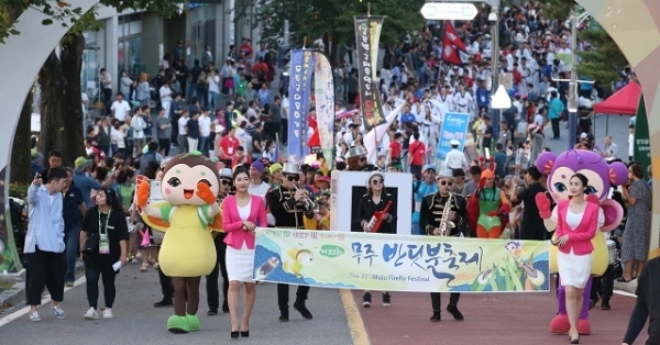 반딧불축제 공식마스코트인 또리와 아로를 선두로 거리악단과 6개 읍면 주민들, 다문화가족과 출향인들, 관광객들, 그리고 11개국에서 온 글로벌태권도시범단원들이 함께 행진을 하는 모습은 보는 이들에게 가슴 벅찬 감동을 선사했다는 평가다.