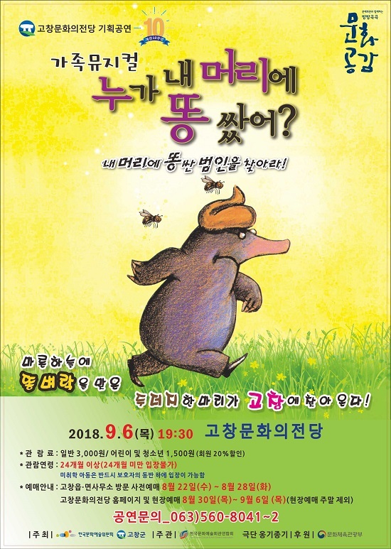 2018년 문예회관과 함께하는 방방곡곡 문화공감 사업 선정 작품인 가족 뮤지컬 ‘누가 내 머리에 똥 쌌어?’는 작은 두더지의 매력이 느껴지고 받은 똥을 똥으로 되갚아준다는 귀여운 복수이야기로 다양한 동물들의 똥의 모습과 특징을 잘 살려내어 보는 이들로 하여금 인상 깊고 자연관찰용으로 아이들과 상호작용하기에 좋은 공연이다.