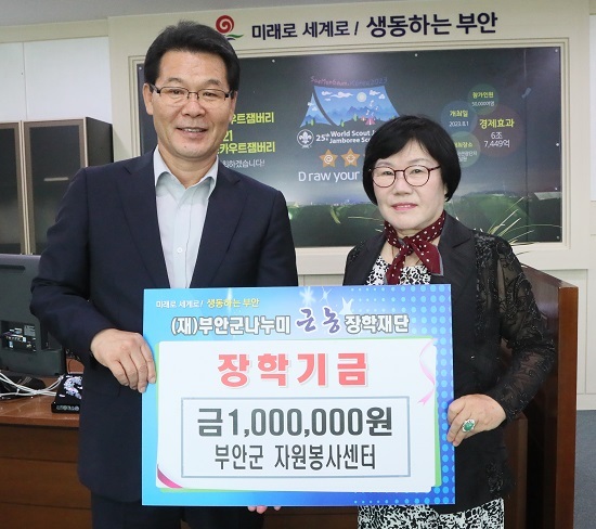 부안군자원봉사센터(센터장 이옥순)는 5일 부안군나누미근농장학재단에 인재육성을 위한 장학금 100만원을 기탁했다.