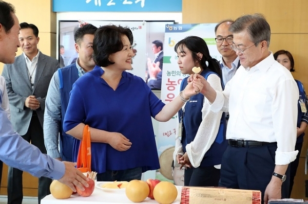 문재인 대통령은 11일 부인 김정숙 여사와 함께 청와대 연풍문 2층에 마련된 추석맞이 농수산물 직거래 장터를 방문해 사과를 시식하고 상품을 둘러보며 대화를 나눴다.