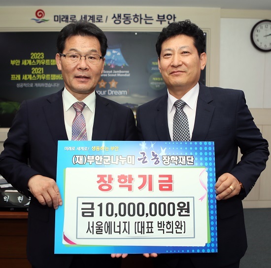 전주시 비전대학교 내에 있는 서울에너지(대표 박희완)는 지난 14일 부안군청을 방문하여 지역사회환원을 위한 장학금 1000만원을 기탁했다.