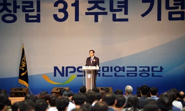 국민연금공단 김성주 이사장이 지난 14일 전북혁신도시 공단 본부 사옥 1층 온누리홀에서 열린 창립 31주년 기념식에서 국민연금 제도개선을 위한 사회적 논의기구 구성을 제안했다.