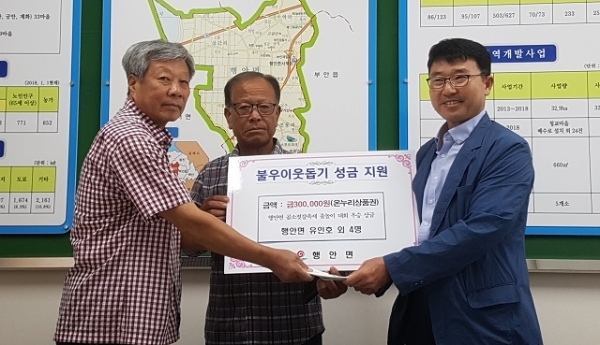 부안군 행안면 유인호 씨 등 주민 5명이 18일 행안면사무소를 방문해 추석명절을 맞아 이웃돕기에 사용해 달라며 30만원 상당 온누리상품권을 기탁했다.