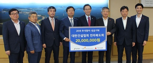 대한건설협회 전라북도회(회장 정대영)는 우리 고유의 민속명절 추석을 맞이하여 18일 전라북도청을 방문해 송하진 도지사에게 불우이웃돕기 성금 2000만원을 전달했다.