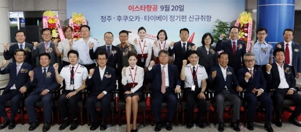 이스타항공이 국내 항공업계 최초로 청주에서 출발하는 일본 후쿠오카, 대만 타이베이행 노선을 20일 취항하고 기념행사를 가졌다.