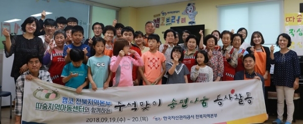 캠코(한국자산관리공사) 전북지역본부(본부장 강희종)는 9월 19일, 20일 양일 전주시 덕진구 따숨지역아동센터 어린이들과 함께 ‘추석맞이 송편나눔’ 봉사활동을 실시했다.