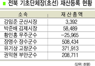 우선 재산을 공개한 6명 기초단체장은 재력과 거리가 먼 것으로 나타났다. 황인홍 무주군수의 경우 본인을 비롯한 가족의 재산으로 마이너스 2596만 5000원을 신고했다. 이어 강임준 군산시장이 339만 2000원으로 두 번째로 재산이 적었다.