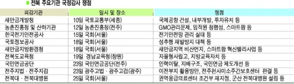전북지역 주요 기관에 대한 국정감사가 오는 10일부터 시작된다. 전북교육청과 전북대·전북대병원, 전주지법과 전주지검이 국감을 받게 되며, 전북혁신도시로 이전한 농촌진흥청과 국민연금공단 등도 올해 현안 중심으로 국감을 받는다. 새만금공항 등 이슈가 산적한 새만금개발청 국감은 관련 기관중 가장 빠른 10일 세종시 국토교통부에서 열린다. 전북지역 주요 기관별 국감 쟁점을 미리 살펴본다.