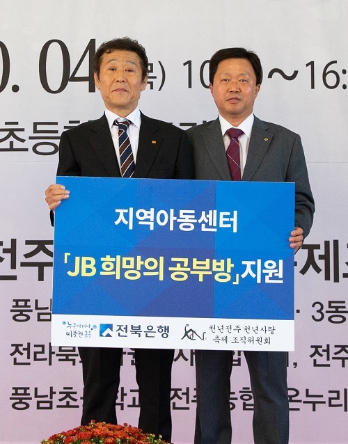JB금융그룹 전북은행(은행장 임용택)은 4일 전주풍남초등학교에서 열린 제8회 천년전주 천년사랑 축제장을 찾아 ‘JB희망의 공부방’ 지원 전달식을 실시했다고 밝혔다.