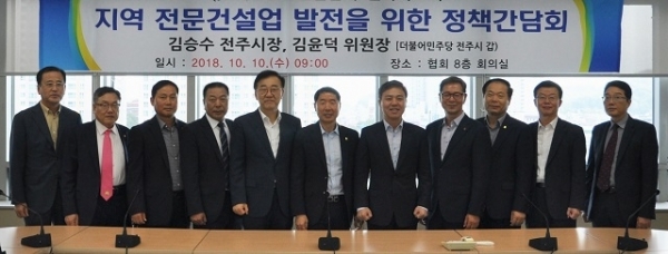 대한전문건설협회 전북도회(회장 김태경)는 10일 김승수 전주시장, 더불어민주당 전주시갑 김윤덕 위원장과 함께 간담회를 갖고, 지역 전문건설업 발전 방안에 대한 의견을 나눴다.