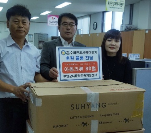 부안군은 (사)수와진의 사랑더하기(이사장 안상수)가 지난 13일 600만 원 상당의 영유아 의류 80점을 부안군 다문화가족지원센터에 기탁했다고 밝혔다.