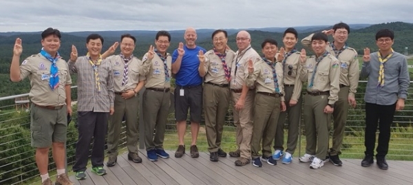 권익현 부안군수가 2019년 제24회 세계스카우트잼버리 개최지가 열리는 미국 웨스트버지니아 서미트 백텔국립공원에서 미국스카우트관계자와 한국스카우트연맹본부, 한국스카우트 전북연맹, 전북도 세계잼버리추진단 관계자들과 기념사진을 촬영하고 있다.