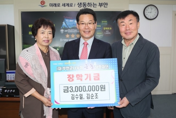 부안군 부안읍 명당마을에 거주하는 김수일·김순조 부부는 지난 17일 부안군 나누미근농장학재단에 인재육성을 위한 장학금 300만원을 기탁했다.