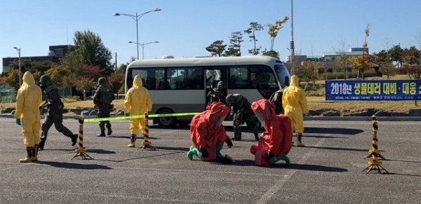 생물테러 대비·대응 소규모 합동훈련이 지난 19일 완주군 문화체육센터 대형주차장에서 실시됐다.
