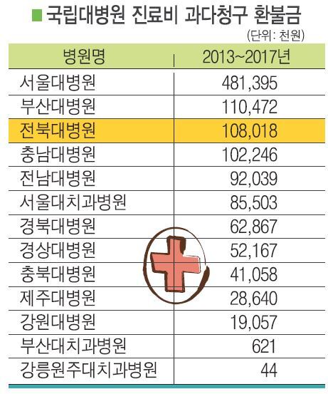 전북대학교 병원이 최근 5년 동안 진료비 과다청구로 인해 환급한 금액이 전국 국립대병원 중 3번째로 많은 것으로 나타났다.