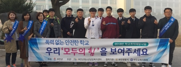 청소년 학교폭력문제가 갈수록 심화되고 있는 상황에서 청소년들에게 학교폭력의 위험성을 알리고 경각심을 일깨워, 안전하고 건전한 학교분위기 조성 및 학교부적응 청소년들을 위해 부안군청소년상담복지센터 홍보 및 청소년전화 1388을 홍보했다.