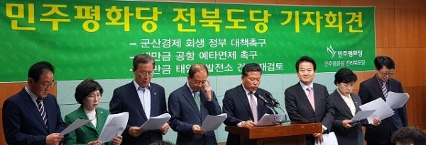 민주평화당은 28일 전북도의회에서 기자회견을 열고, 새만금 신재생에너지사업 중심이 도민이 돼야 한다고 강조했다. 이와함께 군산경제회생을 위한 정부 대책과 새만금공항 예비타당성조사 면제도 촉구했다.