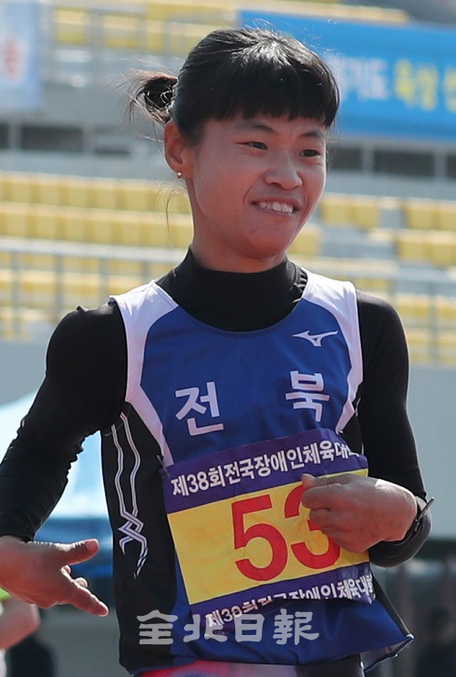 전민재는 28일 익산종합운동장에서 열린 육상 여자 200m(T36) 경기에서 32초 74의 기록으로 가장 먼저 결승선을 통과하며 400m와 100m 우승에 이어 이번 대회 3관왕에 올랐다.