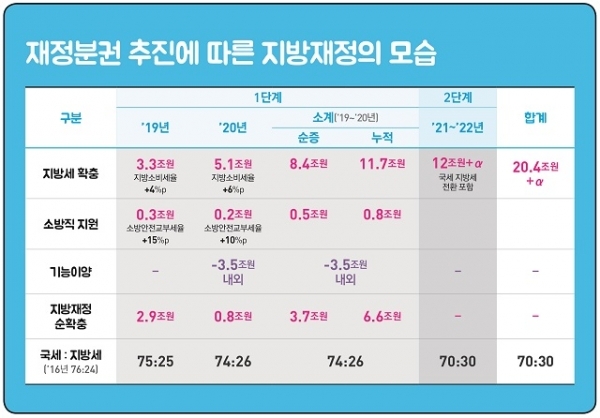 국민의 세부담 증가 없이 국세를 지방세로 이양하는 것으로, 지난 2010년 지방소비세 도입 이후 최대 폭의 지방세 확충이다. 정부는 이 기간 11.7조 원(2019년 3.3조원, 2020년 8.4조원)의 지방재정이 확충될 것으로 전망했다.