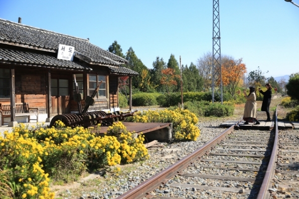 기차가 다니지 않는 남원의 서도역에는 국화꽃이 활짝 피어나 시민들의 발길을 기다리고 있다.