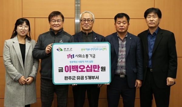 완주군은 5개 유공부서인 기획감사실, 행정지원과, 교육아동복지과, 공동체활력과, 이서면이 ‘1111사회소통 기금’에 총 250만 원을 기부했다고 18일 밝혔다. 이들 부서는 국무총리 표창으로 각100만 원씩의 포상금을 받았다.