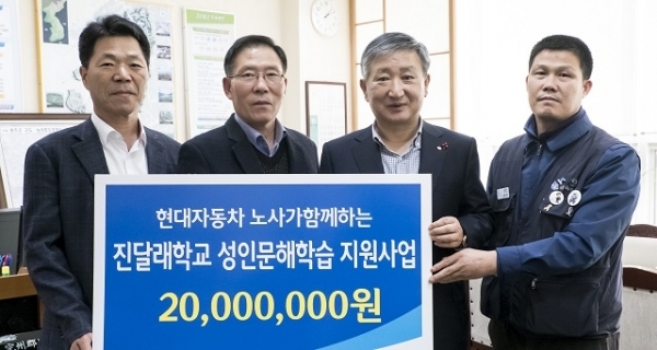 현대자동차 전주공장(공장장 문정훈) 노사는 19일 완주군수실에서 평생학습 프로그램인 완주군 진달래학교 사업 지원성금 2000만 원을 전달했다.