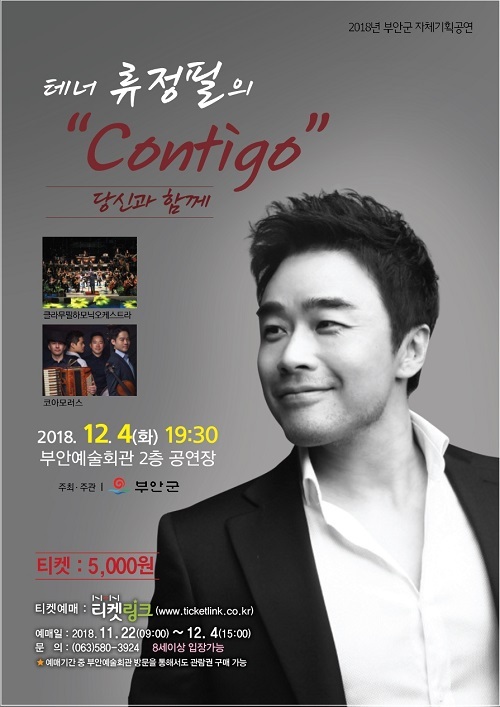 부안군 관계자는 “테너 류정필의 ‘당신과 함께’라는 의미의 콘티고(Contigo) 공연에 오셔서 낭만적인 시간 가지시실 바란다”고 말했다.