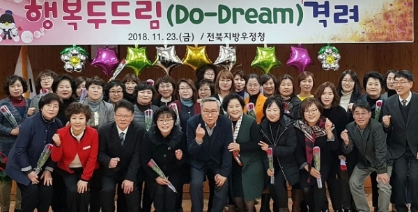 전북지방우정청(청장 김성칠)은 지난 23일 군산 이수연 FC, 완주 원혜정FC, 남원 하서남·김형숙FC, 진안 김정숙FC 등 5명에 대해 올해 3분기 우체국보험 행복두드림(Do-Dream)으로 선정하고 군산우체국에서 격려행사를 개최했다.