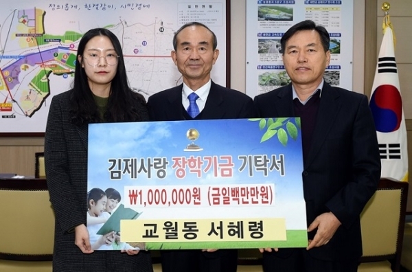 서 씨는 “학창시절 친구들이 김제사랑장학재단에서 지원된 장학금을 받고 꿈을 위해 노력하는 것을 보았다”며 “경제적으로 힘든 지역 우수학생들에게 작은 보탬이 되기를 바란다”고 말했다.