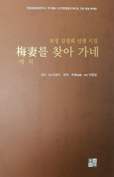 보정 선생이 타계한 뒤 8년만인 1978년 지기와 문우들이 뜻을 모아 선생의 유고문집 <연연당문고> 를 출간했지만, 모두 한문으로 돼 있어 한문에 익숙하지 않은 후학들은 그의 학문과 예술을 접하기가 어려웠다. 이에 김 소장은 대학강단에서 정년퇴직한 뒤부터 조부의 문집을 한글로 번역해 2019년 완간하기로 마음먹었다. 그 첫 번째 결과물이 보정 김정회 선생 시집 <梅妻(매처)를 찾아가네> (감수 연정 김경식, 번역·주해 호당 이정길)이다.