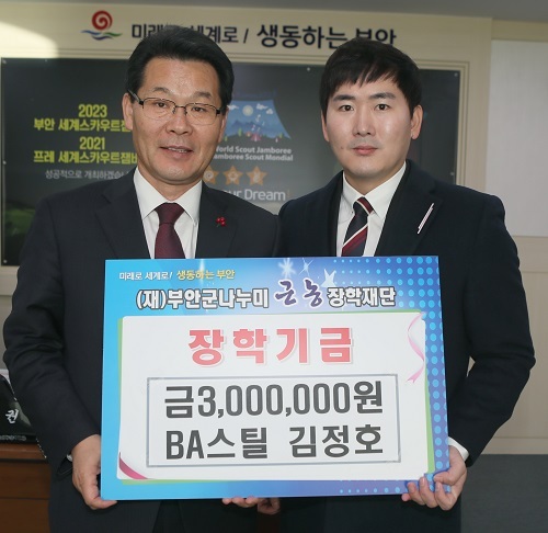 BA스틸 김정호 씨가 5일 부안군나누미근농장학재단에 지역사회 인재육성을 위한 장학금 300만원을 기탁했다.