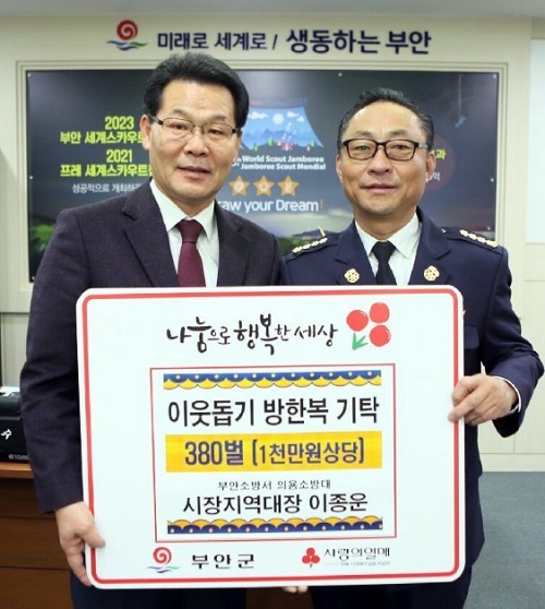 부안소방서(서장 전두표)는 6일 부안의용소방대 이종운 시장지역대장이 관내 소외계층의 따뜻한 겨울나기 지원을 위해 1000만원 상당의 방한복 380벌을 부안군에 기탁했다고 밝혔다.