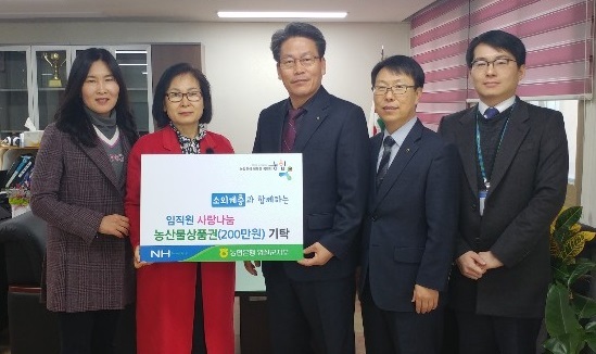 NH농협은행 임실군지부(지부장 이승계)는 5일 임실읍사무소를 방문해 사랑나눔 농산물상품권 200만원어치를 전달했다. 이날 전달된 상품권은 농협임실군지부 임직원들이 지역내 불우이웃을 돕기위해 지난 1년간 성금을 모은 것으로 알려졌다.