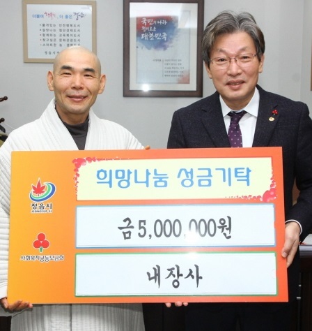 대한불교조계종 내장사(주지 도완 스님)는 11일 정읍시에 희망나눔 성금 500만원을 전달했다.